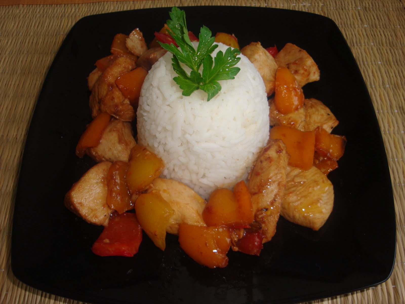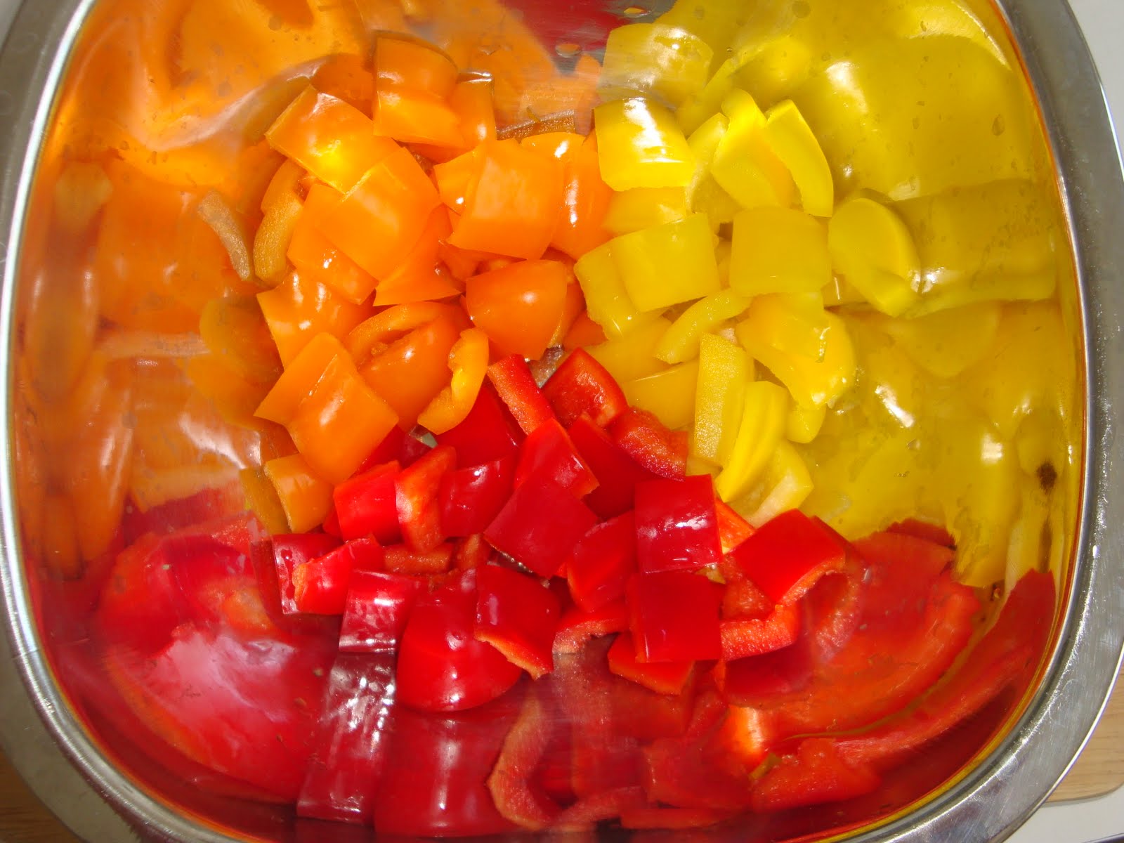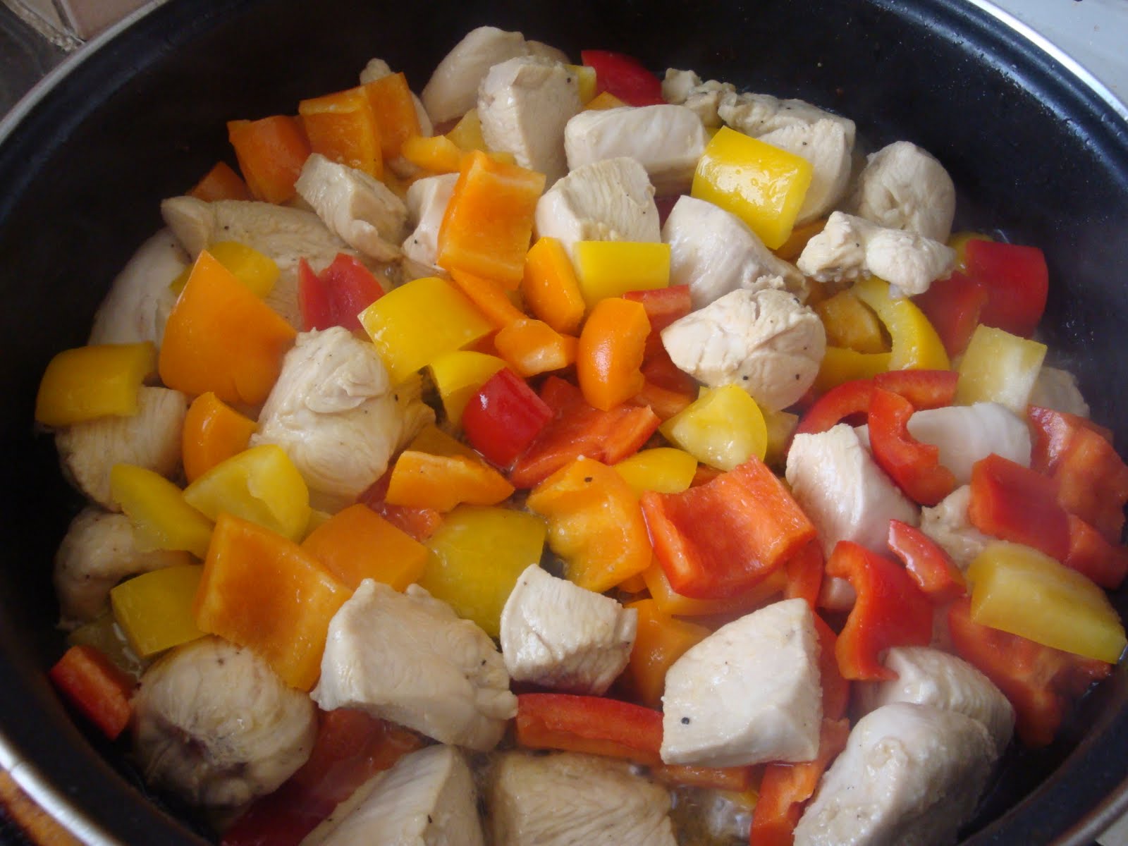 Izmesati sastojke za marinadu, staviti meso, poklopiti sud i ostaviti u frizideru najmanje dva sata. Paprike iseci na kockice. U zagrejan tiganj u koji ne treba da se stavi vise nikakva masnoca, istresti meso sa marinadom, dinstati oko desetak minuta, pojacati temperatuiru, dodati papriku, posoliti i pobiberiti i peci sve zajedno jos oko deset minuta, mesajuci. Na kraju zaliti sa pivom, jos minut dva ostaviti na vatri i zatim je jelo gotovo.