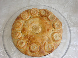 Kalup, velicine oko 24 cm. precnika, namazati margarinom, staviti lisnato testo koje treba da je malo sire od kalupa, tako da ga posle stavljanja nadeva spojimo sa drugim listom testa koji ce doci gore. Od lisnatog testa koje ce ostati visak, isecite trakice sirine oko 1 cm, umotajte u spiralu i ukrasite pitu. :)