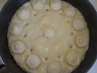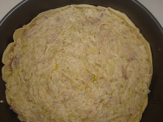 Okruglu tepsiju (ja sam koristila br.26) podmazati uljem i staviti 2 kore ciji krajevi treba da prelaze ivice tepsije tj. da vise sa strane. Poprskati mesavinom ulja i vode.