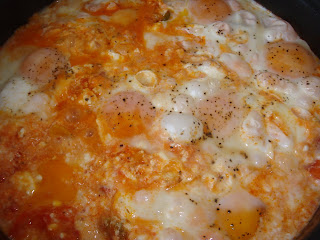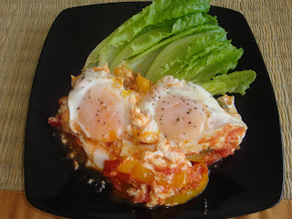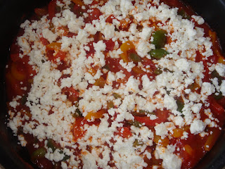 U dubljem tiganju prodinstati nekoliko minuta papriku secena na trakice ili kockice, po zelji. Dodati paradajz, origano, posoliti i dinstati sve zajedno jos oko 10 minuta.Smanjiti temperaturu, posuti feta sirom i odmah preko fete staviti jaja,malo ih posoliti i pobiberiti, poklopiti tiganj i dinstati jos oko 5 minuta, zavisi koliko zelite da su jaja pecena.