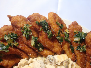 Pilece filete iseci na tanje trake, posoliti, posuti brasnom i izmesati ih tako da svaki komadic bude uvaljan u brasno. Umutiti jaja, prezle i parmezan izmesati u drugoj posudi. Meso prvo uvaljati u jaja pa zatim u prezle i parmezan. Proprziti piletin na vrelom ulju sa obe strane, dok ne porumene.