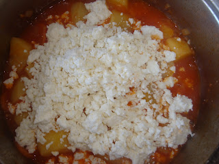 Krompir iseci na kocke, sargarepu na krugove, luk na sitnije kockice, sve zajedno staviti u serpu sa uljem. Dodati izrendan paradajz, sok od paradajza, secer i zacine. Dinstati na tihoj vatri dok krompir ne omeksa, ako je potrebno u toku kuvanja dodati malo tople vode. Na kraju dodati usitnjen feta sir i cim omeksa i stopi se sa ostalim saftom, jelo je gotovo.
